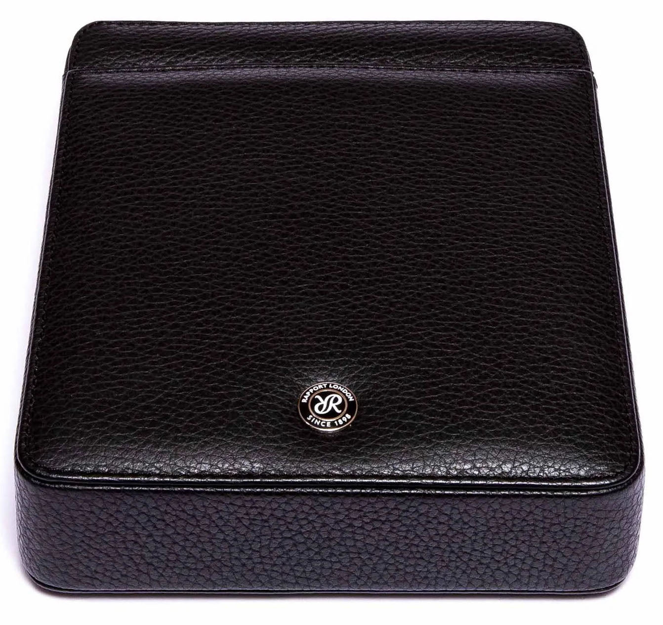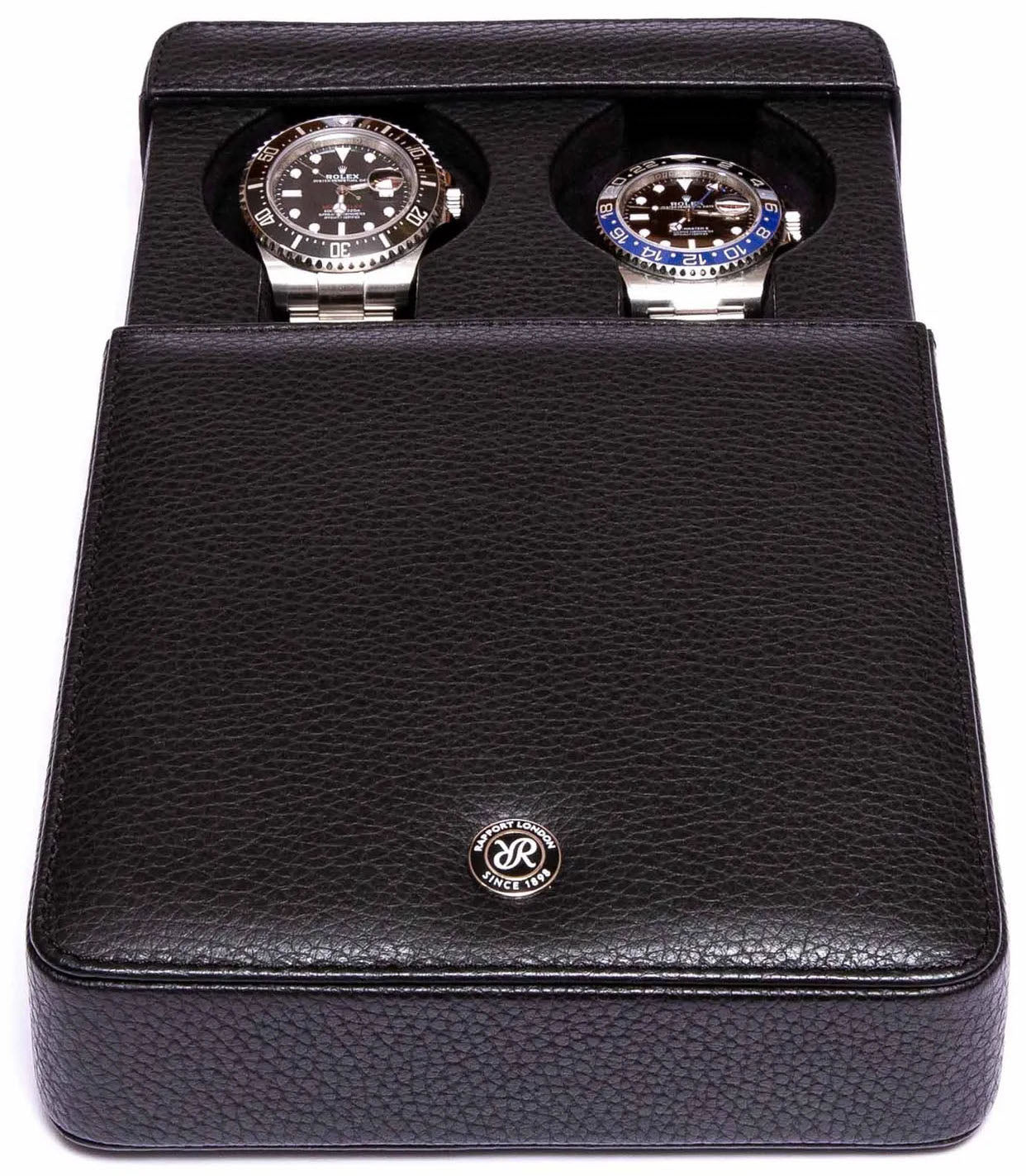 Rapport Watch Slipcase Berkeley 2 Black D170. A robust watch slip storage case made in the finest quality soft pebble grain leather, hand stitched and lined in soft suede. The top of the case slides away from the base revealing a cut-out section to position your two watches securely. It is the ideal watch accessory for travelling or storage at home.