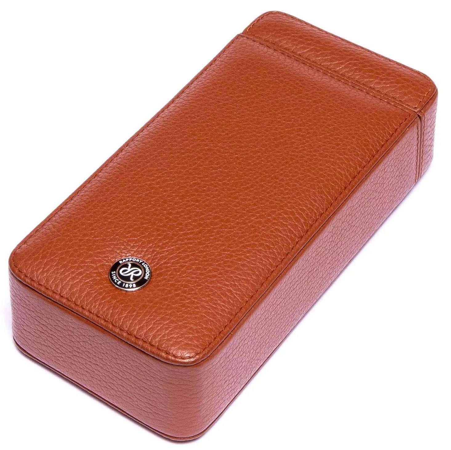 Rapport Watch Slipcase Berkeley Single Tan D161. A robust single watch slip case made in the finest quality soft pebble grain leather, hand stitched and lined in soft suede. The top of the case slides away from the base revealing a cut out section to place Rapport watch in securely. It is ideal for travelling and protecting Rapport watch at home.