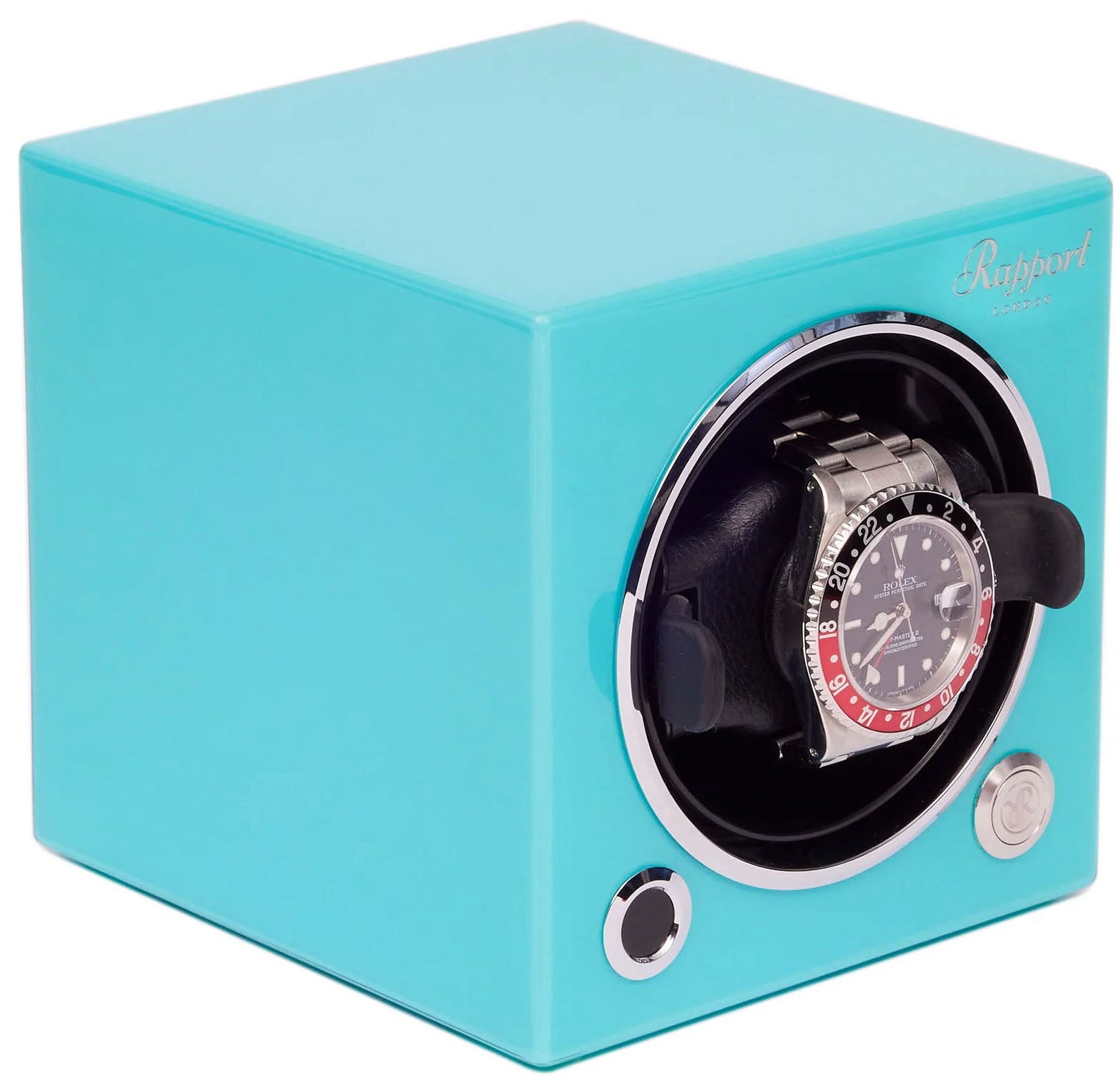 Rapport Watch Winder Evo Single Aquamarine Blue Limited Edition EVO46. Introducing the Aqua Limited Edition EVO Watch Winder. The “EVOLUTION MKIII single watch winder cube has been developed in a range of sleek, high gloss colRapports and designed to be collected together. The EVO cube is precision crafted from wood and applied with eight layers of lacquer. The soft leather cushion securely holds Rapport watch with adjustable side clips. The cube offers multiple levels of control and a three direction setting, and runs virtually silent.