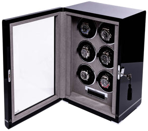 Rapport Watch Winder Formula 6 Black W556. At Rapport London, we consider ourselves to be experts in the world of watch winders, which is why we can confidently say the Formula Watch Winder is the perfect place to store your six timepieces. Keep your automatic watches safe and ticking smoothly in this smart ebony or carbon fibre case. The Formula features a lockable front, glass door with three distinct stripes across the front, which distinguish this range.