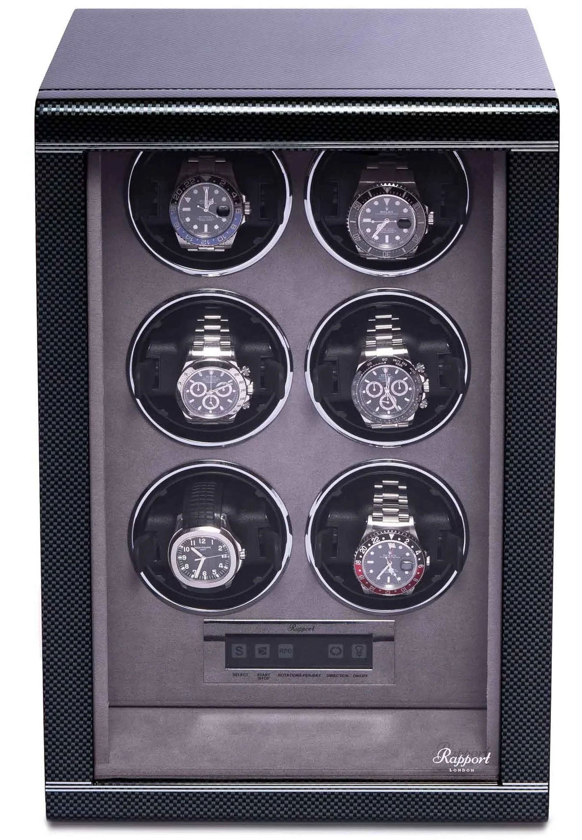 Rapport Watch Winder Formula 6 Carbon Fibre W566. At Rapport London, we consider ourselves to be experts in the world of watch winders, which is why we can confidently say the Formula Watch Winder is the perfect place to store your six timepieces. Keep your automatic watches safe and ticking smoothly in this smart ebony or carbon fibre case. The Formula features a lockable front, glass door with three distinct stripes across the front, which distinguish this range.