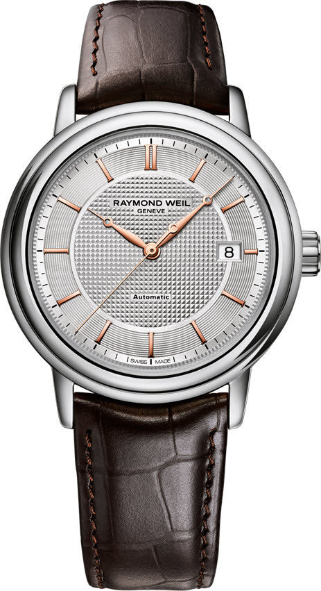 Raymond Weil Watch Maestro Mens. Maestro means master, a person who excels in the practice of an art. In music, this word refers to the esteem commanded by a grand personality, composer or conductor. With the creation of a timepiece inspired by the passionate workmanship and Swiss watchmaking know how handed down from generation to generation, isnÕt there a bit of the Maestro in Raymond Weil watches itself? The collection of the same name, created in 2010, certainly evidences all the mastery of a watchmaker, who knows how to synchronize the rhythms of tradition and innovation.