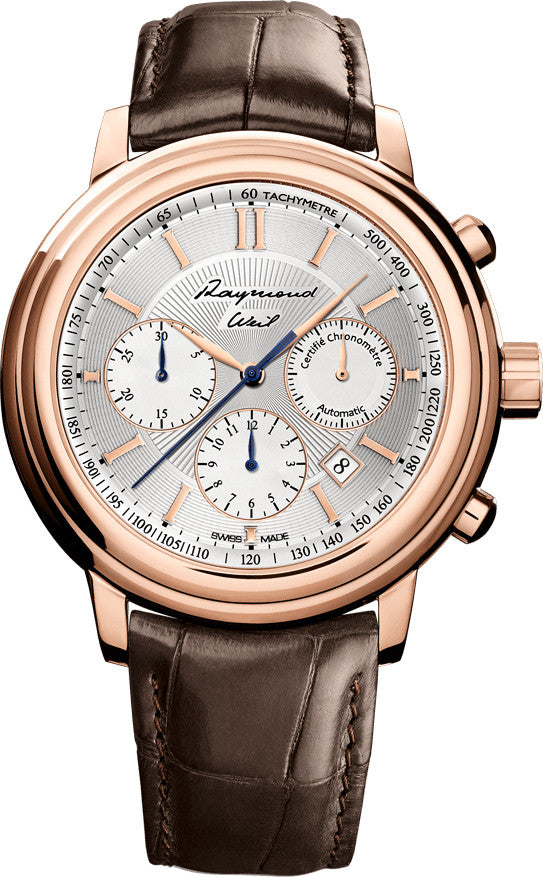 Raymond Weil Watch Maestro Limited Edition 14845-GC5-65001. Created as a tribute to a lifes work, this timepiece pays homage to Mr Raymond Weil eponymous founder of the Raymond Weil brand. An automatic winding mechanical heart, equipped with a 42 hour power reserve, sits inside this COSC certified chronometer. The 45mm 18K rose gold case shelters a dial featuring Raymond Weils hand written signature. The distinctive sign of high quality watch movements, a cotes de Geneve decoration embellishes the skeleton oscillating weight adorned with the Raymond Weil monogram. Presented in a prestigious box made of olive tree wood and bearing Raymond Weils signature, the timepiece expresses all of its personality, flattered by an impressive showcase of craftsmanship.