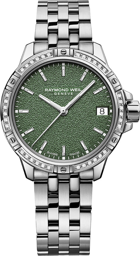 Raymond Weil Watch Tango Green Frost Diamond 5960-STS-52061. The tango collection embodies the passion that RAYMOND WEIL, the Swiss watchmaker, puts into achieving timepieces of both aesthetic sensuality of design and rhythmic perfection. Distinctive style with a balance of proportions, the tango collection is easily recognised by its distinguishing signature bezel and six decorative screws. You will now find larger case sizes for ladies looking for an oversized watch; we offer additional dial combinations and sapphire crystal glass to add extra protection against everyday knocks. Each ladies’ tango watch is water resistant to 100m and includes a quartz movement.