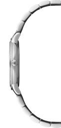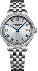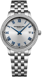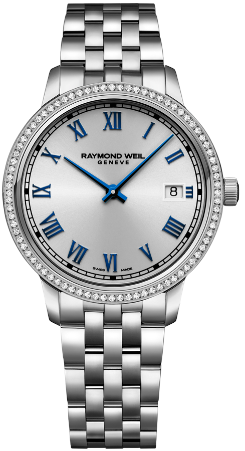 Raymond Weil Watch Toccata Ladies 5385-STS-00653. Equipped with a quartz movement and made entirely of stainless steel, this toccata ladies’ timepiece features a 34mm case decorated with 80 single-cut diamonds. With a date window at 3 o’clock, the silver lacquered and sunray satin-finished dial is set with applied Roman numeral indexes and has a railway-track chapter ring that aids readability. To complement this modern classic, a pair of blue hands has been added. Refined design and timeless materials: the toccata collection celebrates the artistic and musical spirit behind the Brand’s DNA. Following in the footsteps of the great composers, toccata promotes the Swiss horology of RAYMOND WEIL while respecting the tradition and heritage handed down from generation to generation within the family company.