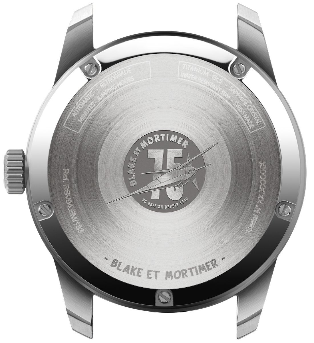 Reservoir Watch Blake and Mortimer By Jove Bracelet RSV04.BM/133.BA. In the heart of Asia on September 26, 1946, Colonel Olrik is preparing to lead an armada of bombers to set the capitals of the free world ablaze, “By Jove !!! in England, Captain Francis Blake and Professor Philip Mortimer are determined to lead the resistance. Anniversary watch commemorating the 75th anniversary of the inaugural adventure of "Blake and Mortimer", the first graphic novel designed and scripted by Edgar P. Jacobs: "Le Secret de l’Espadon".