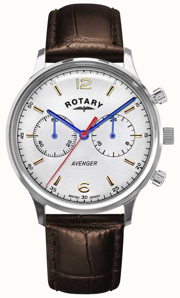 Rotary Watch Avenger Mens GS05203/70. The Rotary watches Avenger is back and here to stay. Originally launched back in 1960, this watch collection signifies clean vintage design at its very best. Expertly designed the Avenger makes a style statement on any wrist. Based on a retro quartz model from Rotarys rich archive of museum pieces, Avenger still maintains its vintage aesthetic with clean lines and bubble mineral glass. Subtle modern touches update this heritage collection. The case size has increased to 38mm while the dial boasts a dual contemporary finish, the outer dial features a radial brush whilst the inner dial has a galvanic finish. Luminous hands and hour markers make the dial easy to read in the dark and the addition of calf leather straps and 3 link bracelet accentuate the vintage look.