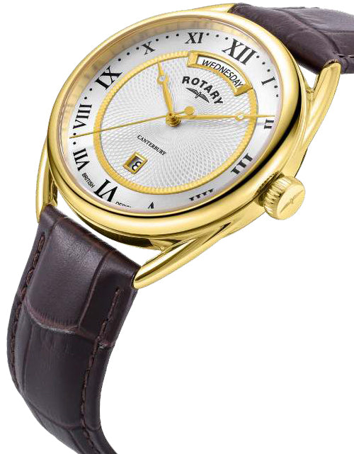 Rotary Watch Canterbury Mens GS05533/21. The Canterbury daydate looks to a bring a new Era of ultra classic Rotary designs that Rotary are known for. The design takes design cues from the popular Sherlock Watch and pushes these details. The new guilloche spiral texture elevates the dial while encased in a fluid wired lug case design that flows onto the wrist.