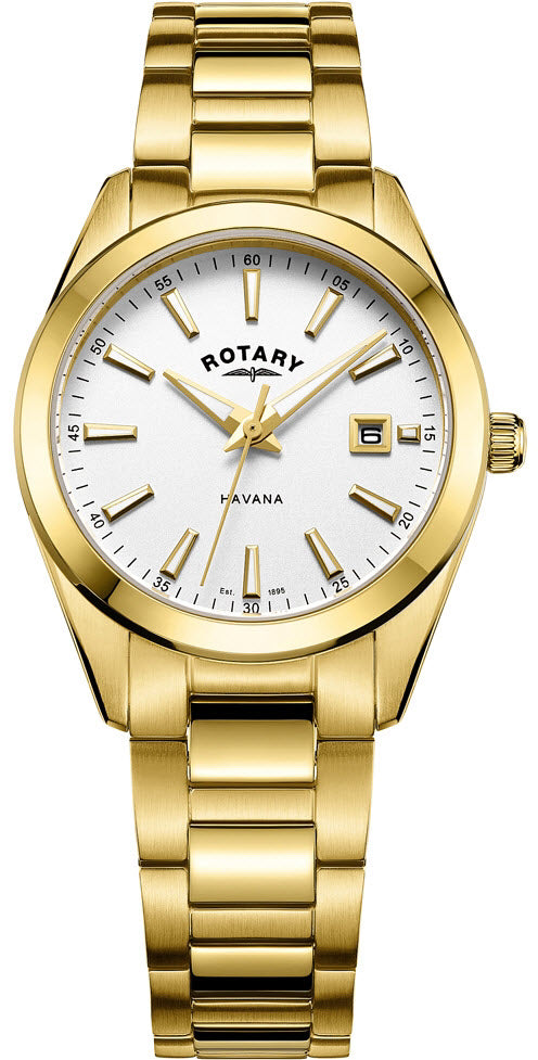 Rotary Watch Havana Ladies LB05081/02. Havana offers a highly desirable collection of ladies quartz watches, delivering a classic, sleek, elementary design representative of Rotary. Housed in a 31mm case featuring; inner minute tracker, Sapphire glass, date window and emblematic gold PVD H link bracelet.
