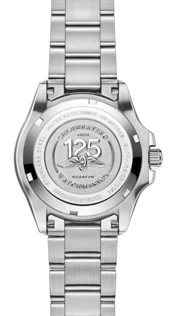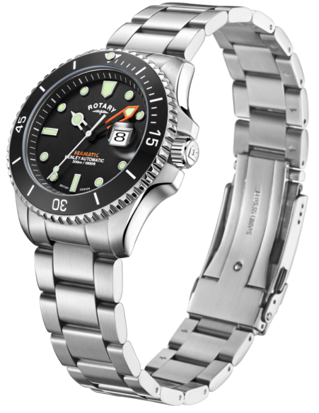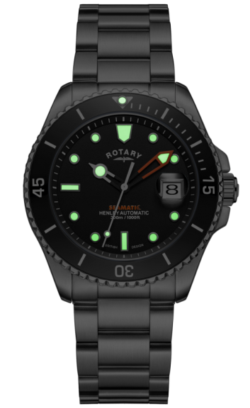 Rotary Watch Henley Seamatic GB05430/04. This Henley Seamatic divers watch features a stainless steel case and 3 link bracelet, which is secured by a Divers Z clasp for optimised security. The black dial, which displays luminous indices and open hour/minute hands, is protected beneath sapphire glass which hosts a cyclops magnifier over the date window. This timepiece also features a black unidirectional bezel, and on the side of the 42mm case is a crown and crown guard. Powered by a reliable Miyota 8215 movement, the watch is water resistant to 300m.
