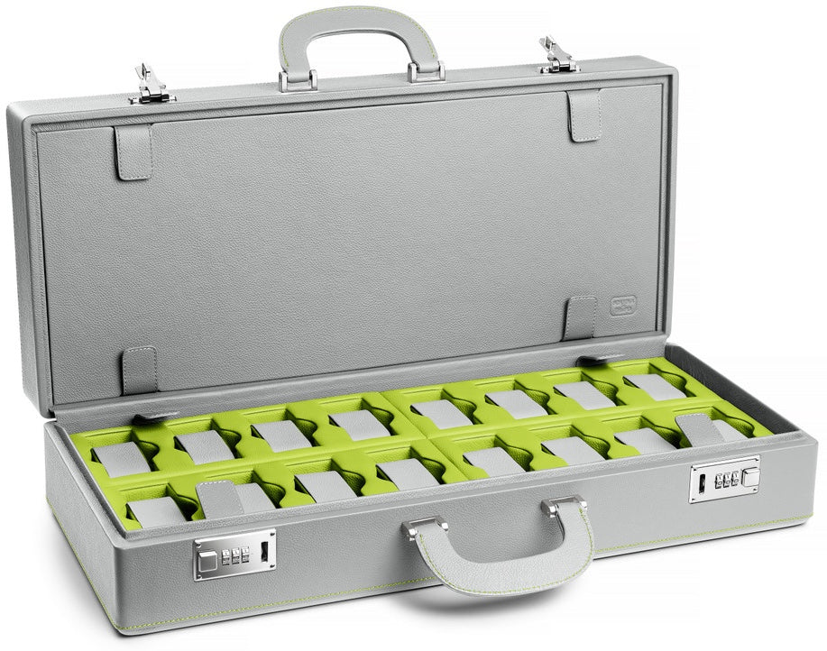 Scatola del Tempo Watch Case Valigetta 32 Grey Green 05010.GGRSIL. Full leather carrying case with combination locks for 32 watches with leather straps or bracelet suitable for regular size watches and oversize ones (diameter of the case, crown included, 56mm).