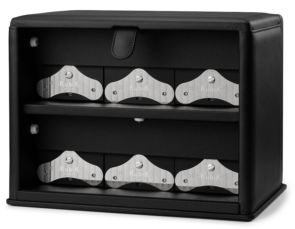 Scatola del Tempo Watch Winder Rotore 9 Black 02072 Black. Full leather case with 9 programmable winders. Containing a watch holder able to hold watch cases of every shape and dimension. With independent lines of winders that can be programmed separately. The entire winding system can easily be removed and stored into a safe. Silver coloured clasp.