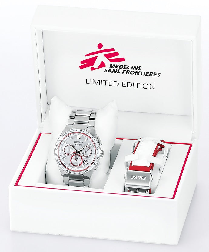 Seiko Astron Watch Medecins Sans Frontieres Solar GPS Limited Edition SSH133J1. This limited edition timepiece has been designed in conjunction with Médecins Sans Frontières – Seiko will donate proceeds from the sale of this model to the international relief organisation. Médecins Sans Frontières was founded to provide medical assistance to people affected by conflict, epidemics, disasters or excluded from healthcare and comprises 45,000 health professionals in over 70 countries.