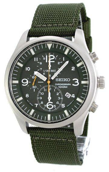 This Seiko Chronograph comes in a military style. The case is made of steel and the dial color is green. The strap is in the same colour. The case width is 43 millimetres. Seiko Chronograph has a hidden folding clasp.