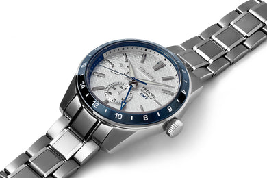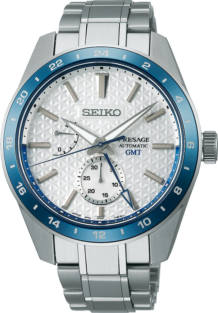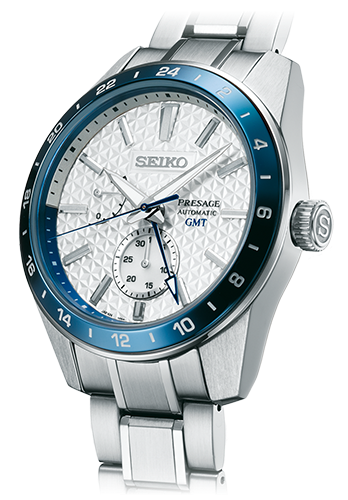 This watch, with an eyecatching blue bezel, is from the popular Presage Sharp Edged series and has been designed for practical international timekeeping.