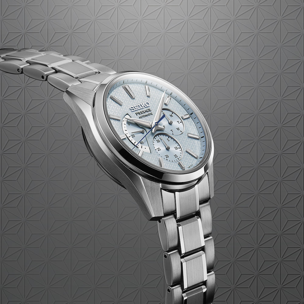 The dials on Presage Sharp Edged timepieces feature a traditional Japanese pattern designed to bring growth and success. This angular ancient hemp print has been seen in Japanese artisan objects since the Heian period (794-1185) and features on textiles and interior styles.