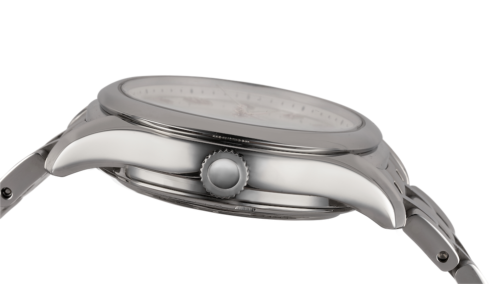 The dial’s depth and rich texture echoes a Karesansui or Zen garden in which gravel is raked into serene patterns like waves or rippling water.