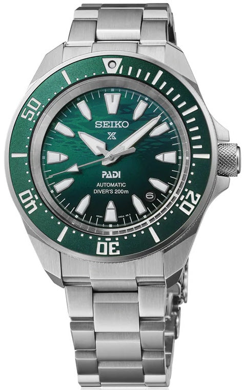 Seiko Prospex PADI 60th Anniversary 4R Compact Mechanical Divers Underwater Green Watch SRPL53K1. This Seiko Prospex diver’s watch has been created in collaboration with PADI – the Professional Association of Diving instructors, the world’s most recognised diver’s training organisation. It commemorates 60 years of Seiko watchmaking heritage in Diver’s watches.