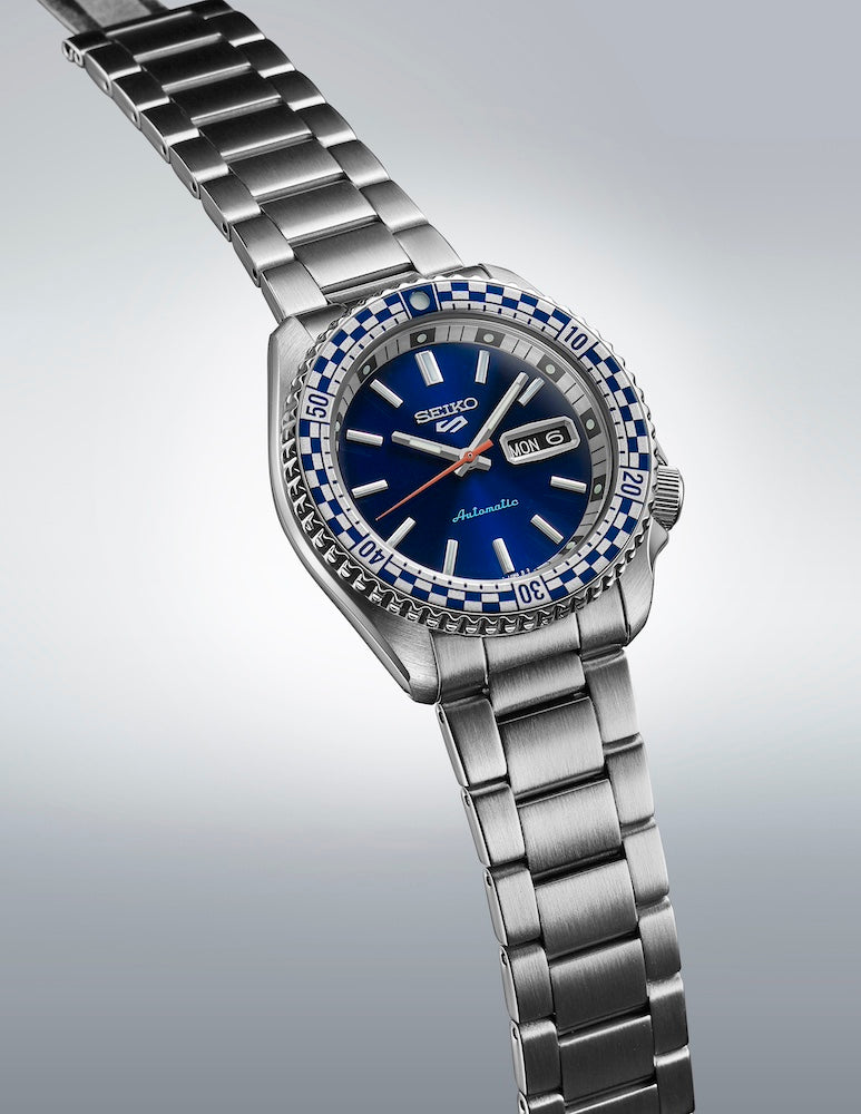 As a re-creation of the 1969 piece, this model maintains the looks and petrol blue colour scheme. It features the same dial, 60s-style hands, and checkered bezel as the original. It also pays homage to the fan-favourite Seiko 5 Sports SKX case design.