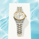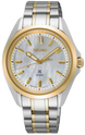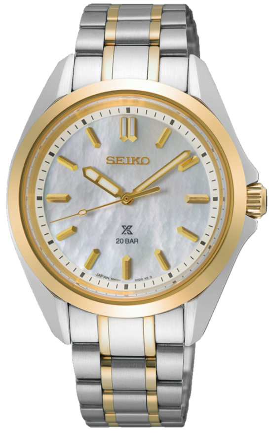The Seiko Prospex watch reference SUR608J1 features a mother of pearl dial with Lumibrite hour markers and hands etched in gold. These features, along with a minute ring, are protected underneath a sapphire crystal glass, while beneath these shimmering surfaces is a reliable quartz movement. The watch wraps around the wrist with a two tone stainless steel and yellow gold coloured bracelet, securing with a three fold clasp for added durability.