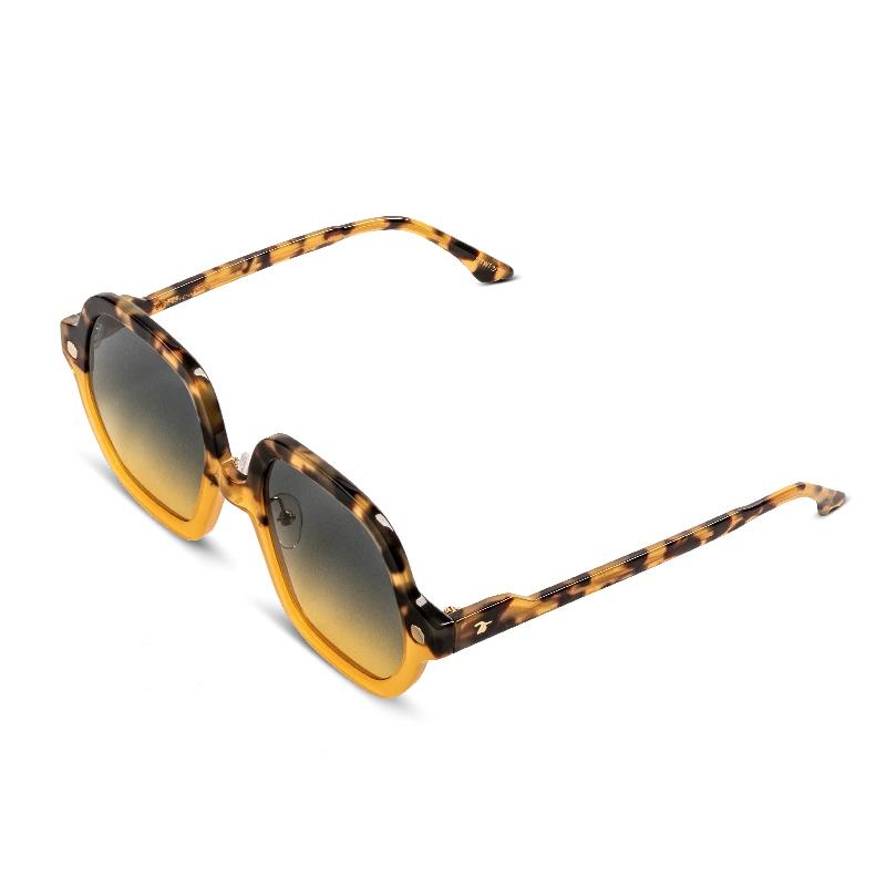 Temple: 155mm. Polished yellow hues tortoise acetate Inlayed 2N color polished stainless steel 7F logo.