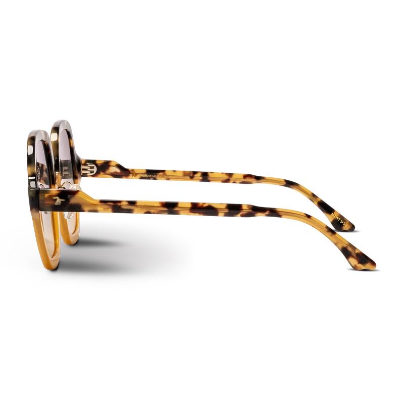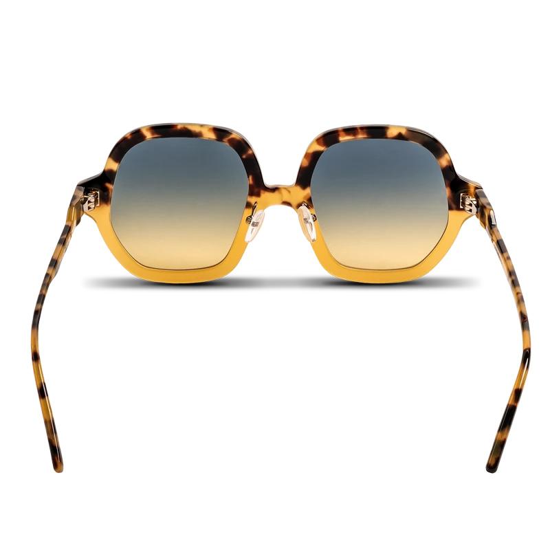 Frame: Polished yellow hues tortoise acetate. Applied 2N color polished TV shape signature. Oversized frames with mid bridge position. Front width: 154.4 mm Lenses: H:53.6mm X W:53,3mm. Adjustable silicone pads.