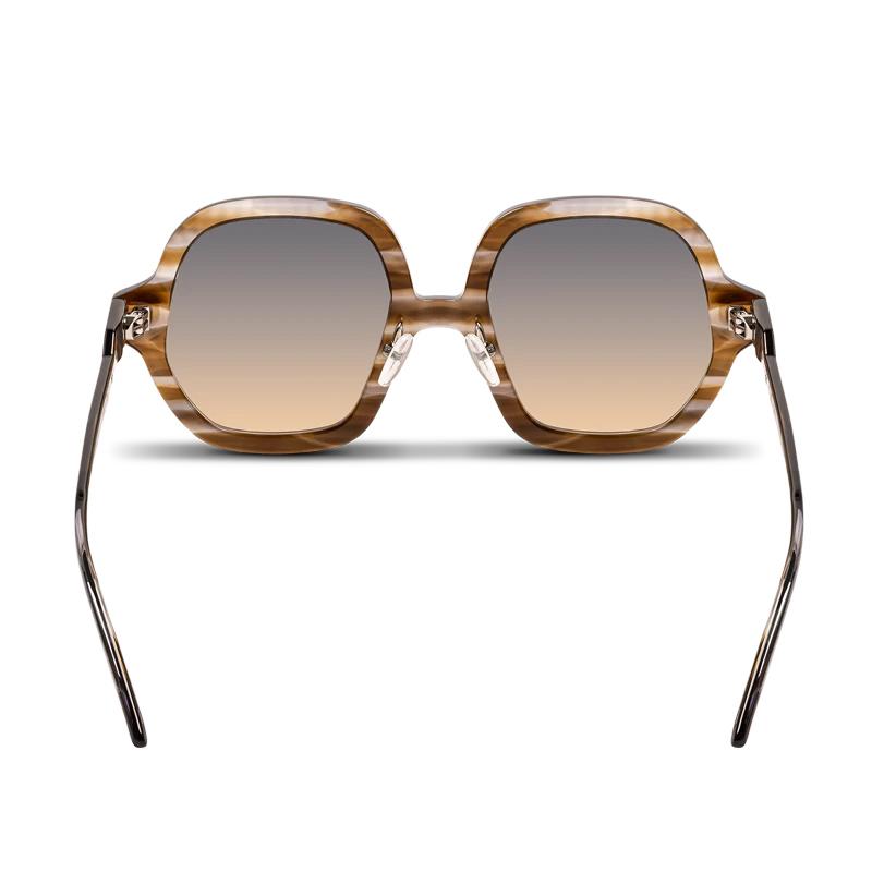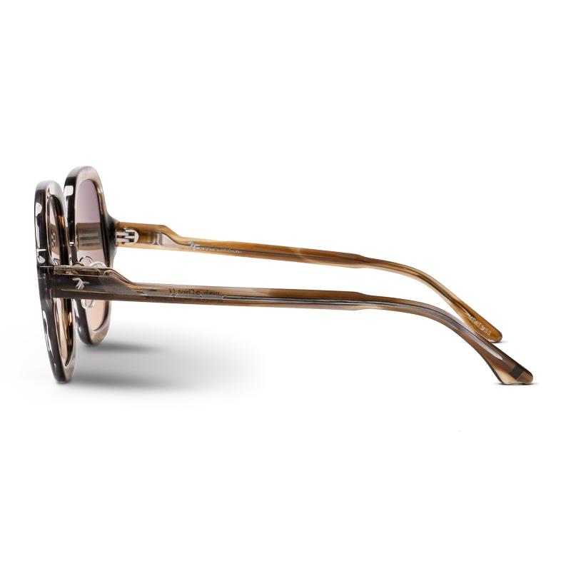 Frame: Polished yellow hues tortoise acetate. Applied 2N color polished TV shape signature. Oversized frames with mid bridge position. Front width: 154,4mm Lenses: H:53,6mm, W:53,3mm. Adjustable silicone pads.