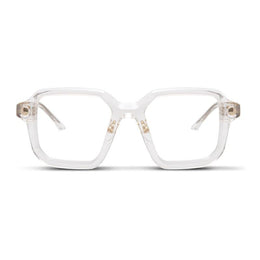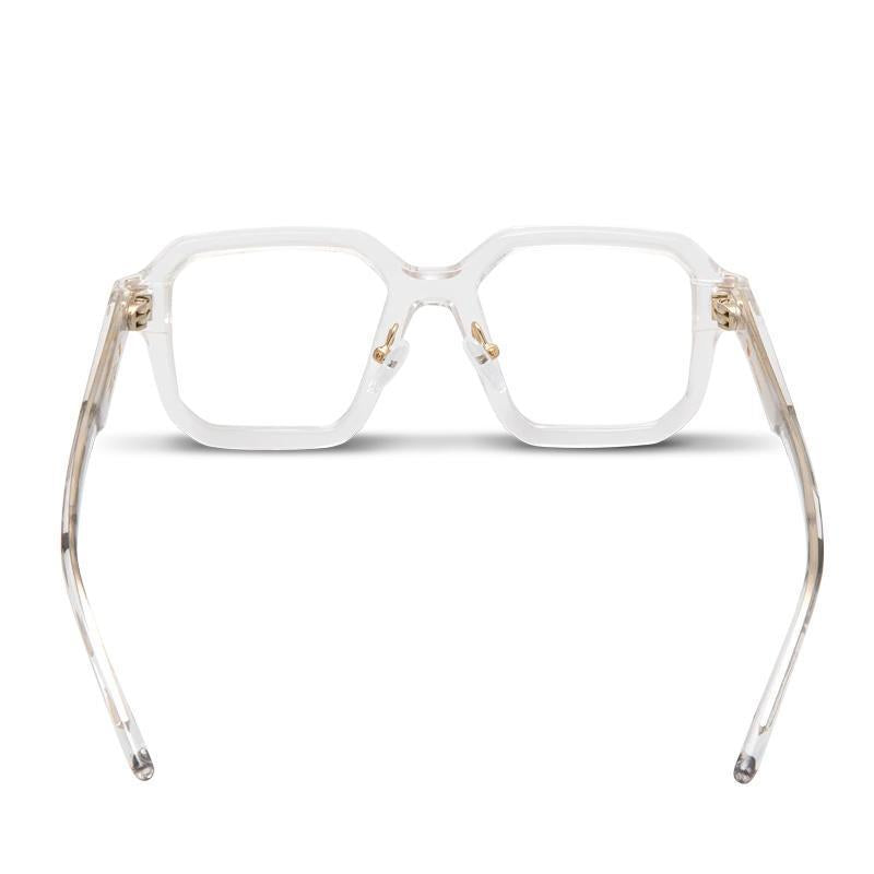 Frame: Clear acetate. Applied brushed TV shape signature.