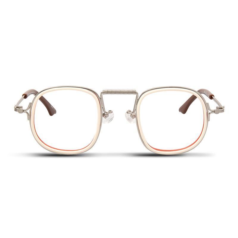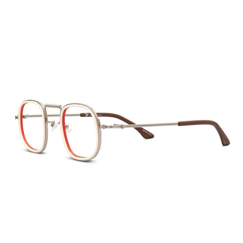 Frame Material: Polished solid ivory beige acetate framing the lenses on the front, polished solid orange acetate on the back. Applied polished TV shape signature.
