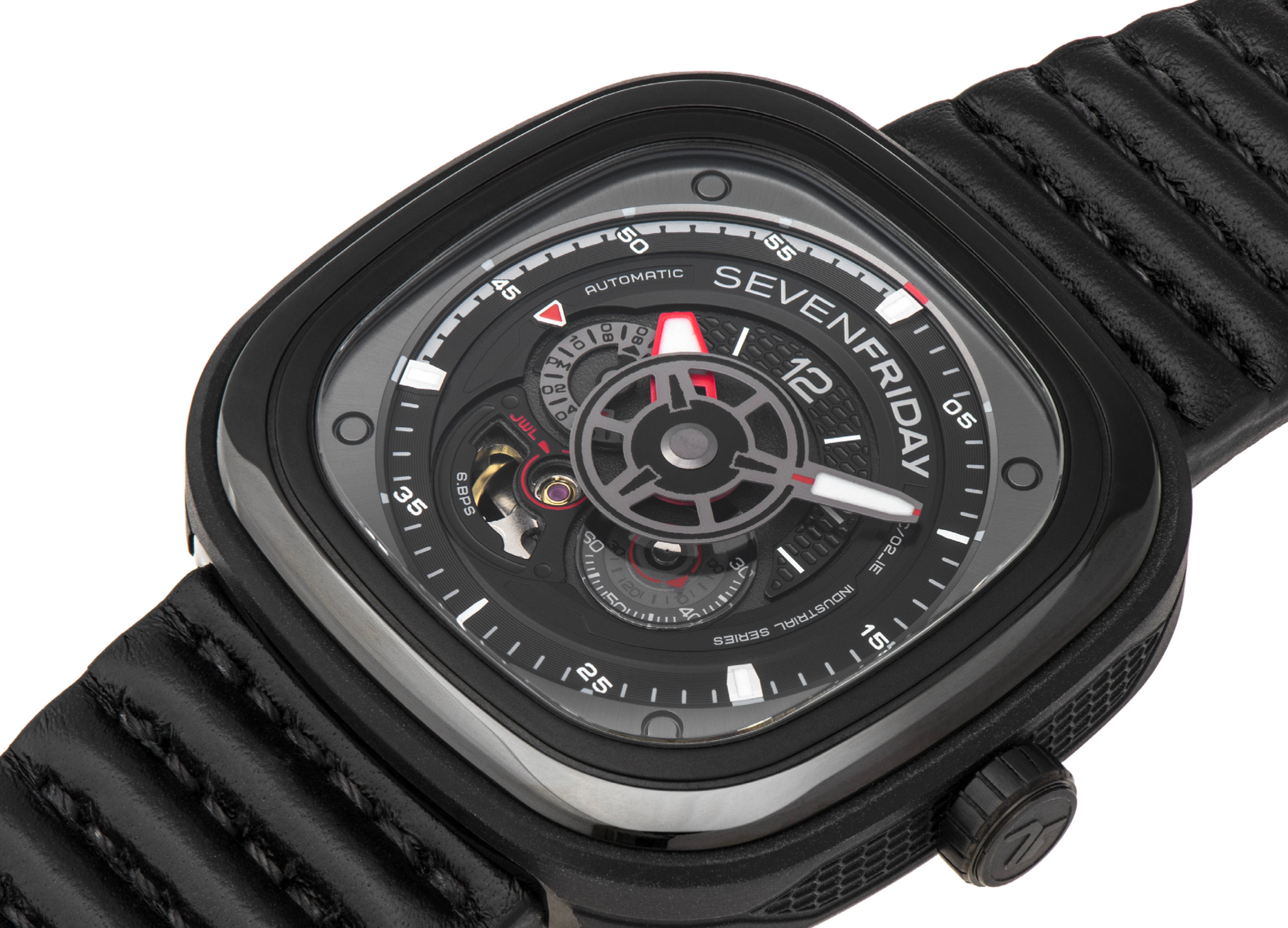 SevenFriday Watch P3C/02L Racer III P3C/02L. A passion for the high octane, heartbeat inducing world of two wheeled motor sport inspires this SevenFriday P3C/02 ÒRacer III. Following in the footsteps of two SevenFriday giants, the iconic P3 and P3B models. The Racer conjures all the high speed excitement of unadulterated tyre to track action, where power and courage meet precision. Combined with refined masculine good looks, The Racer III takes on definitive motor sport design codes, featuring a black leather strap and rubber animation ring with bursts of red within the stitching and tachometer to show the potential to ignite. The first of our watches to feature 100m water resistance, The Racer III is ideal for the active lifestyle and perfect for the open road, where riders can share in the bond between man and machine.