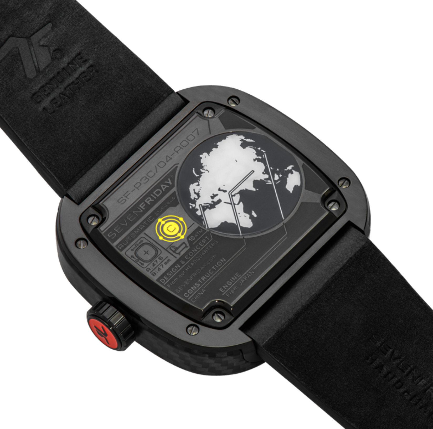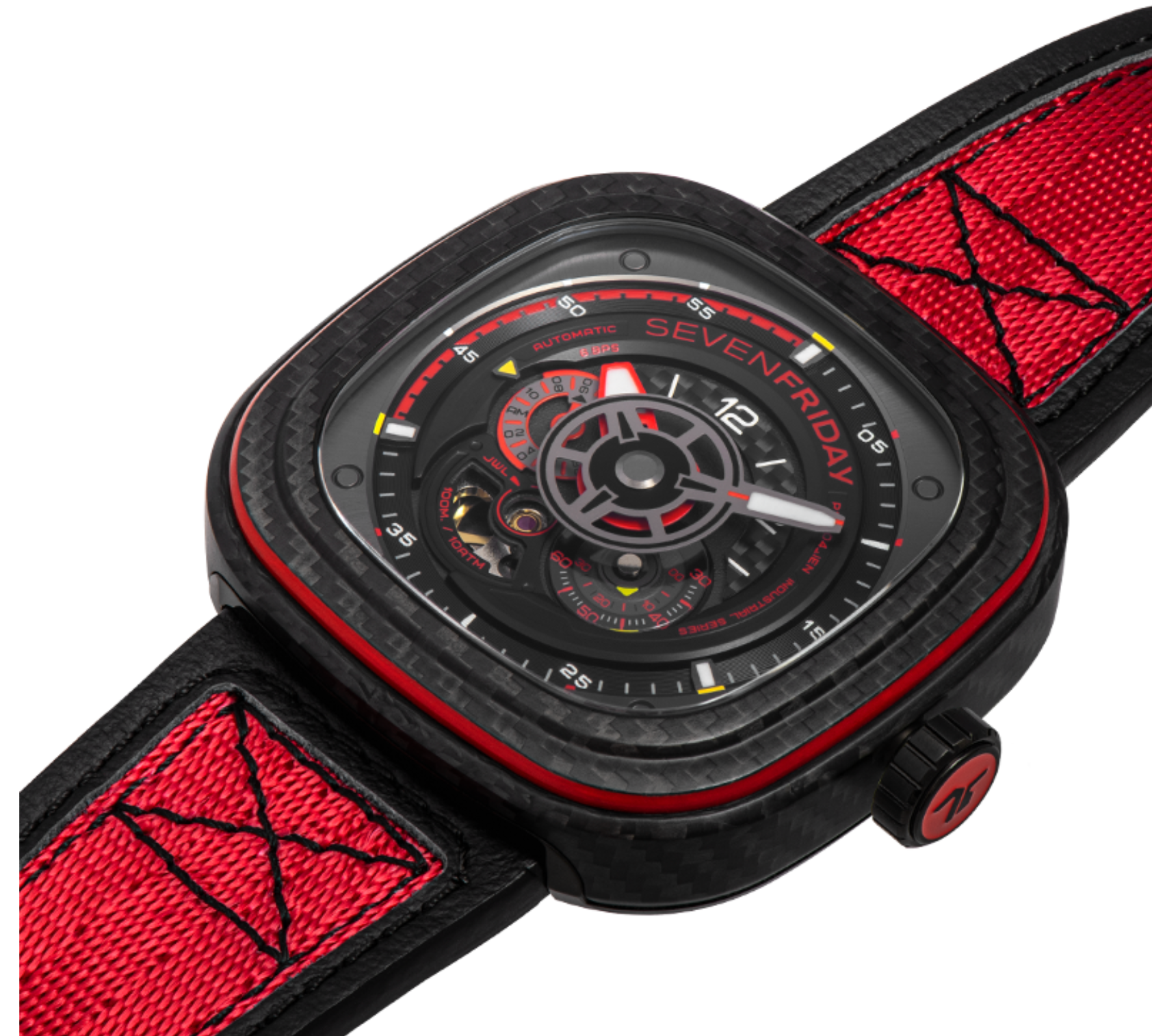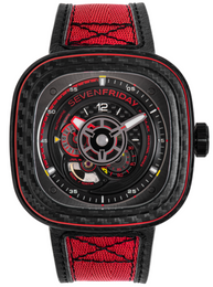 SevenFriday Watch P3C/04 Red Carbon. Like a crimson flag to a bull, the new SEVENFRIDAY watch P3C/04 Red Carbon will set your heart racing and ignite a passion that will only be quenched by strapping this unique piece to your wrist. The combination of carbon fibre animation ring, red resin highlight, red lacquered screw down crown, are features that will push your ticker, the one inside, into the red zone. But its the strap that'll get your blood pumping hard. Made from competition strength seat belt material, it adds a little twist with a SF UV signature.