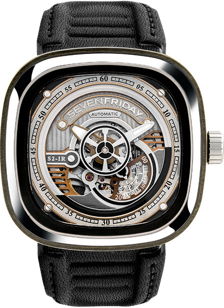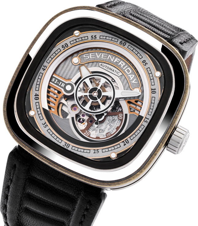 SevenFriday Watch S2/01 Brassy S2/01. Like the ubiquitous valve that patinas with good use, the S2/01 is a study of the hard working machines that helped define the second industrial revolution. The rhodium and antique brass open design detail surrounded by an antique brass animation ring of the S2/01 shows the deep appreciation for the valve as the workhorse of the industrial revolution. The S2/01 is a noteworthy timepiece that exemplifies for the individual, the pride and progression of its industrial revolution influences