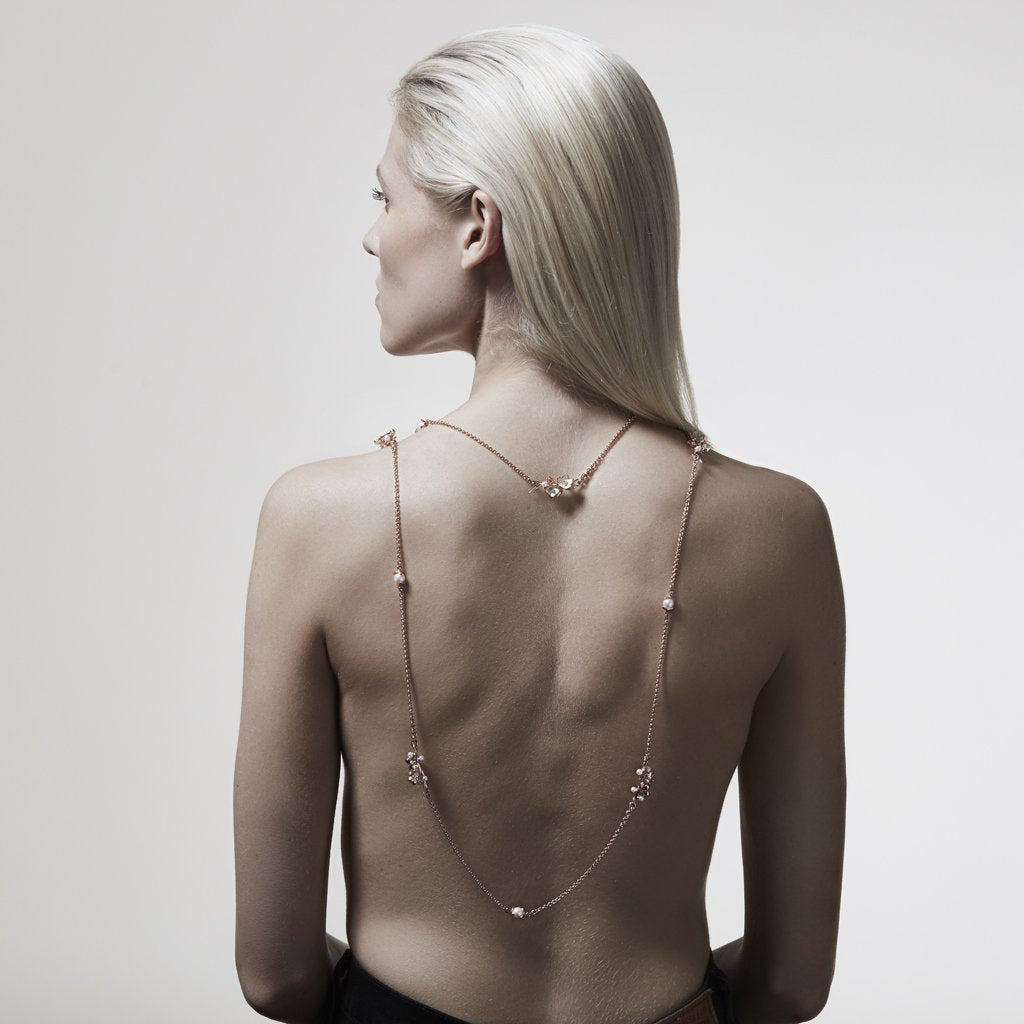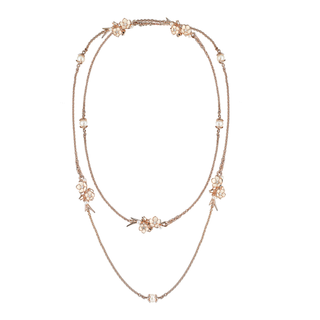 A timeless symbol of elegance and sophistication, this classic piece is revisited by Shaun Leane. Strength and fragility, a delicate representation of ivory enamelled flowers encapsulated within a Cherry Blossom motif. This sautoir necklace is crafted in 18ct Rose Gold Plated Sterling Silver and adorned with 0.80cts of brilliant cut diamonds. Worn as a long necklace or wrapped twice, this pendant evolves through the day and blooms into an evening piece.