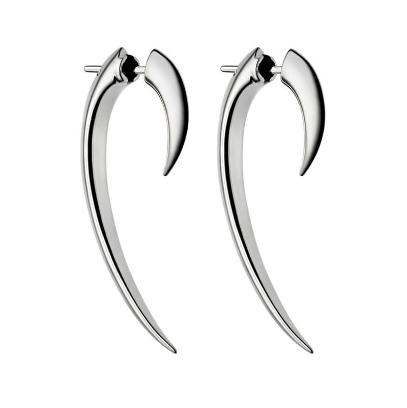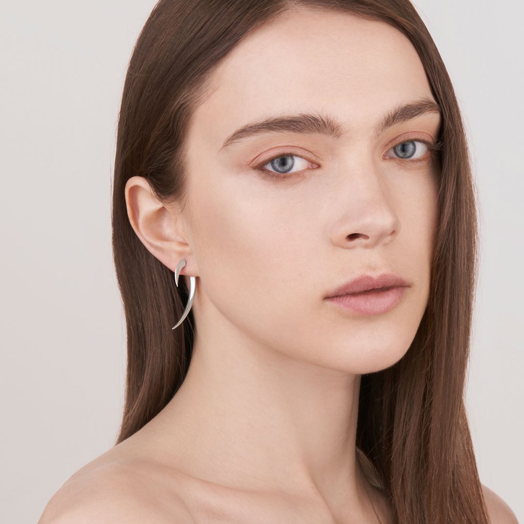 Our sterling silver hook earrings are pure and seductive. One-of-a kind pieces, these cool silver earrings make a fierce and daring addition to our silver designer jewellery collections. A versatile everyday piece, the long silver statement earrings come as a two piece construction that seamlessly fit together at the back and front creating a formidable silhouette around the ear. Available as pairs and as single earrings.