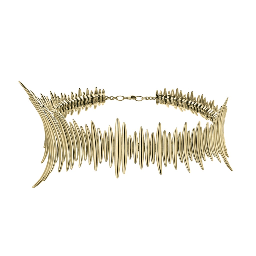 Elegant and pure, this 18ct Yellow Gold Plated Sterling Silver quill choker has been expertly designed and crafted by the House of Shaun Leane. An architectural composition of our radiant and iconic silver quills, make a fearless and dynamic statement with this fierce, alluring and unique quill choker.