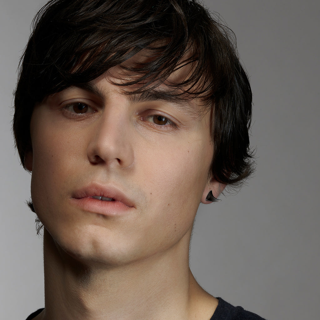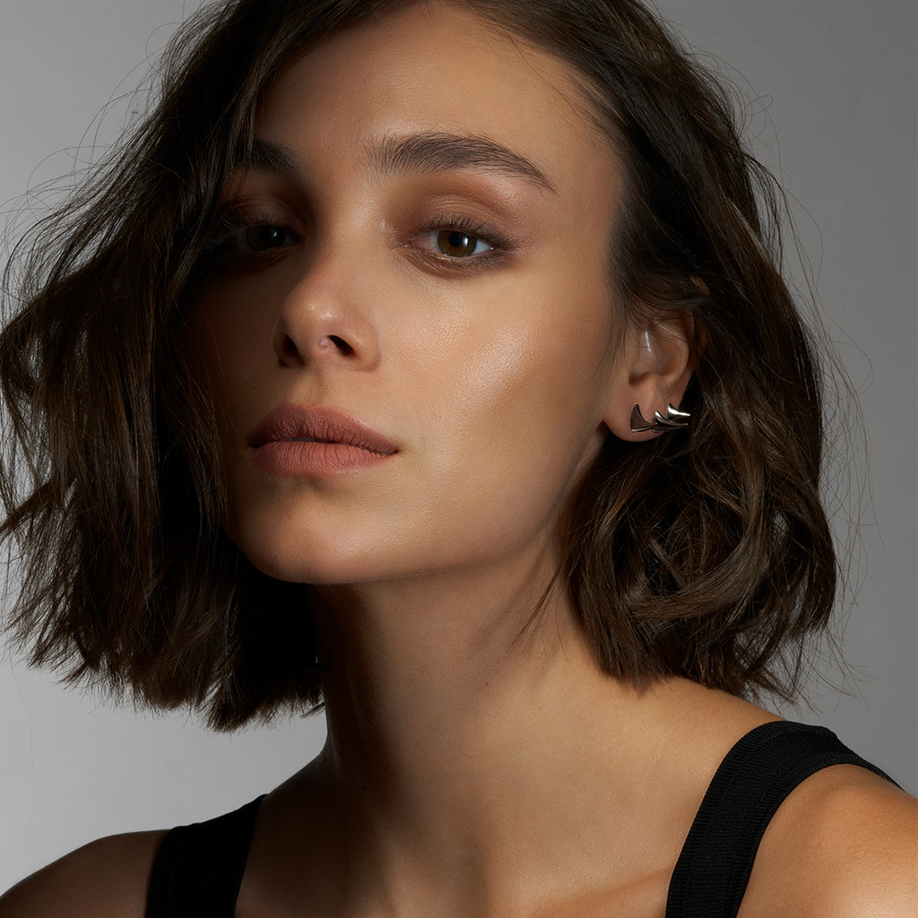 Revisiting the pointed silver thorn studs from Alexander McQueen runways in the 1990s, where they were placed on models' faces, these silver black rhodium large stud earrings' figurative design work and organic shape references the natural world. A statement and daring look - a modern day armour. Dimensions: 14mm.