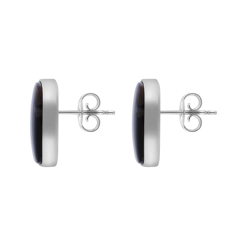These Sterling Silver Blue John Oblong Drop Earrings feature two distinct Blue John stones, each measuring 16 x 11mm. The oblong shape elegantly highlights the natural veining and rich blue-purple hues characteristic of Blue John, a rare gemstone prized for its unique beauty. Set in sterling silver, the drop design provides a graceful movement that catches light and attention, making these earrings a sophisticated accessory for both formal and casual occasions. Perfect for collectors and enthusiasts, they combine expert craftsmanship with the timeless appeal of this exceptional mineral.