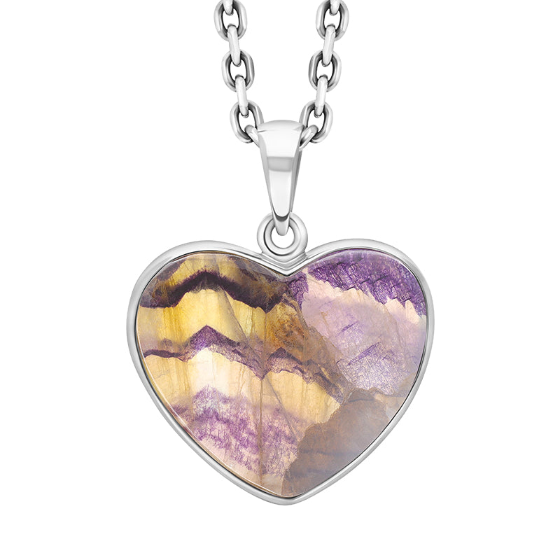 This exquisite pendant is a part of the Unique collection, handmade by C W Sellors. Hand cut, set and polished in our very own workshop, this pendant features an heart shaped Blue John gemstone, set in sterling silver.