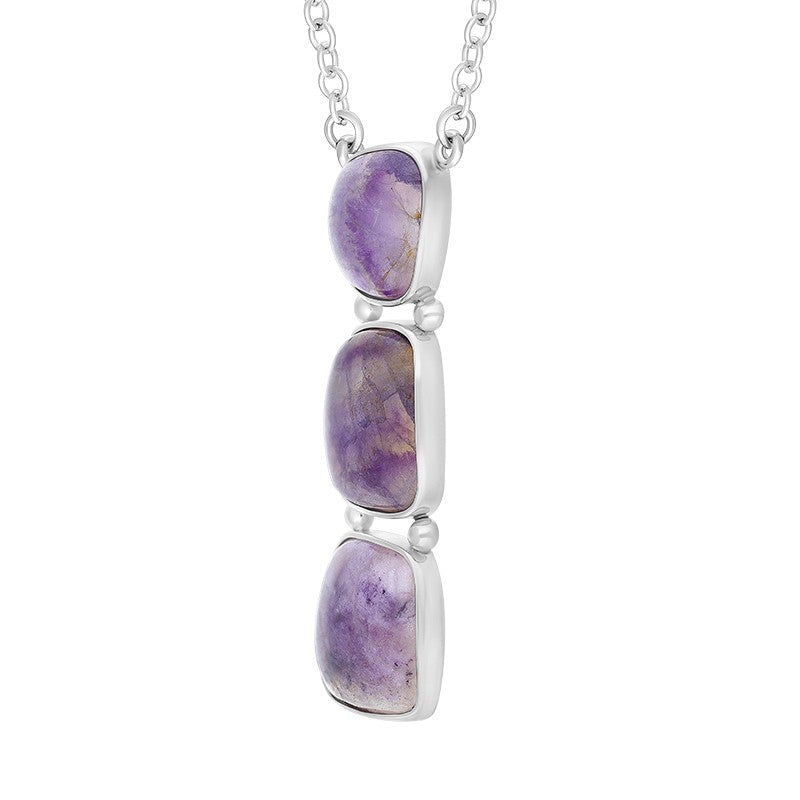 The Sterling Silver Blue John Three Stone Abstract Oval Necklace features three uniquely shaped Blue John stones, each measuring 25 x 12mm, 30 x 13mm, and 26 x 11mm, set in a sophisticated abstract design. Expertly crafted in sterling silver, this necklace highlights the striking blue and purple hues of Blue John mineral, celebrated for its natural rarity and captivating appearance. The arrangement of the stones creates a modern, artistic aesthetic that complements both casual and formal styles. This piece offers a distinctive blend of natural beauty and expert craftsmanship, making it a standout addition to any refined jewellery collection.