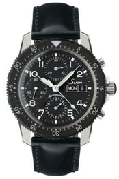 The 103 chronograph range by Sinn has been designed to be functional and very easy to read. This timepiece comes with Valjoux 7750 automatic movement. It performs 28 800 vibrations per hour and has 25 bearing jewels. For convenience, the watch has a 42-hour power reserve. It comes equipped with subsidiary seconds and complete chronograph functions. Additional features include a day and date window at the 3 o'clock mark, luminous hands and numerals, pilot's bezel, pressure resistance and shock-resistant acrylic glass.