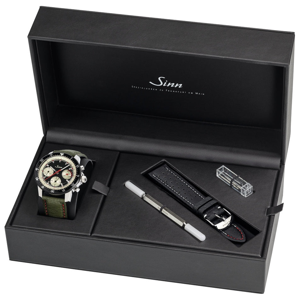 Sinn watch 103 St Ty Hd Set Limited Edition 103.211 Set. The 103 St Ty Hd model is a contemporary tribute to its prestigious predecessors, as it is also equipped with shock resistant acrylic glass and hand wound movement. Furthermore, a SINN watch with a hand wound movement from the 103 series was last officially available around 20 years ago, which makes the release of the 103 St Ty Hd model all the more special still. The special calibre is a classic Tri-Compax chronograph dedicated to functionality, a 30 minute counter at 3 o clock, 12 hour counter at 6 o clock and small seconds at 9 o clock on a matt black dial.