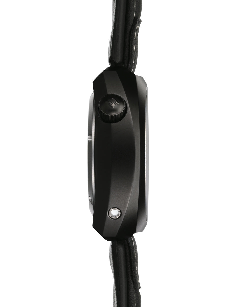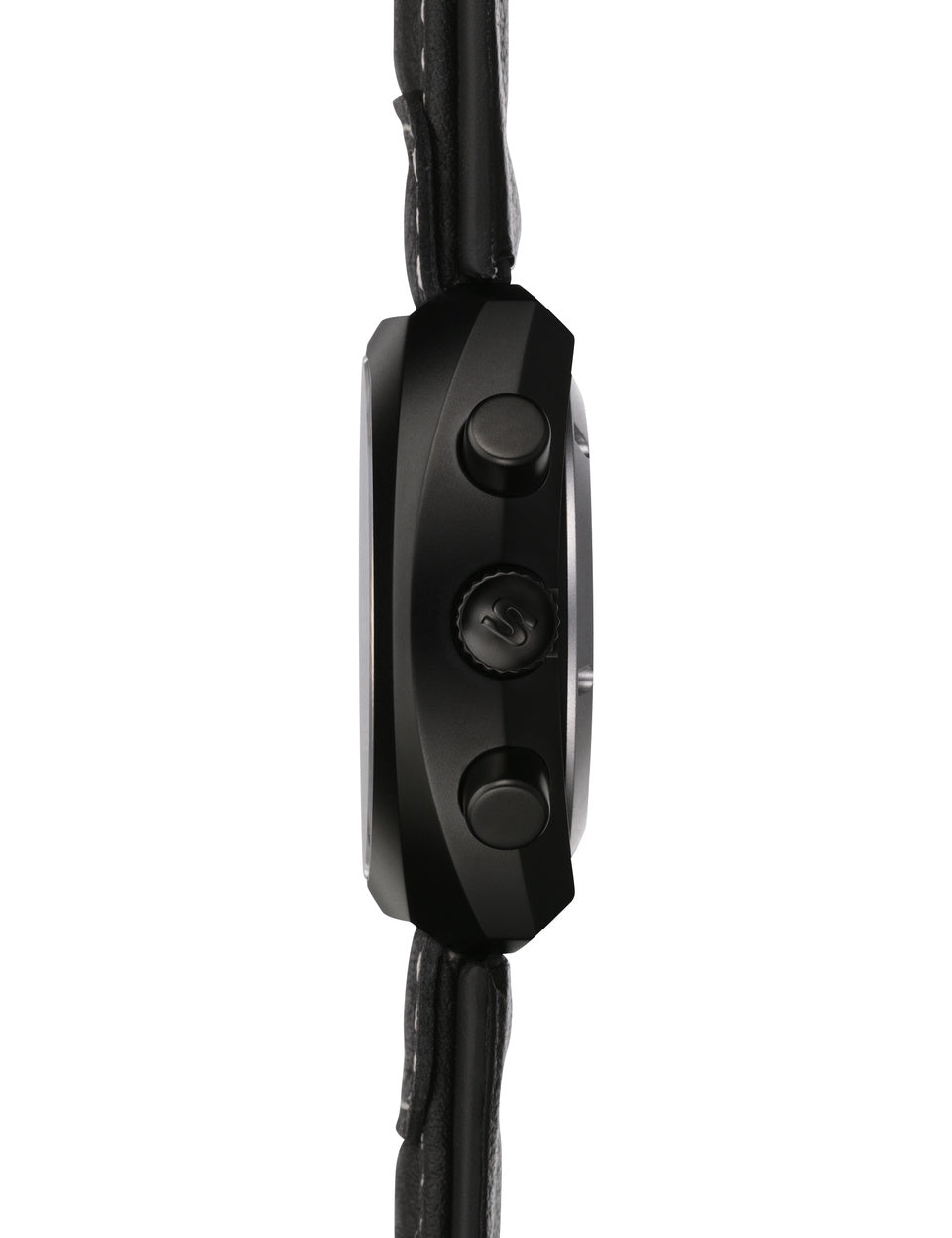 Powered by the Sinn self winding mechanism SZ01, this Sinn 140 ST S watch boasts a striking black coated stainless steel case that has been crafted with scratch resistant TEGIMENT technology and uses the Sinn D3-System on both the push pieces and crown. The matte black dial looks striking below the sapphire crystal glass with anti reflective treatment, and like most Sinn watches, the dial is adorned with indices, hands and numerals coated in luminescent material for easy legibility. To complete the look of the timepiece, a black leather strap and stainless steel buckle is added.