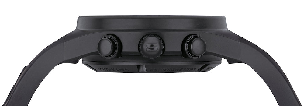 The Sinn 144 St S Anniversary Limited Edition watch also recalls the original 1974 model through the dial and its sporty sloping tachymeter and pulsometer ring. In a bi-compax layout, the Concepto C99001 self-winding mechanism delivers central hands for hours, minutes and chronograph seconds, small continuous seconds and two chronograph counters highlighted in a classic reverse panda colourway. The 30 minutes counter and 12 hours counter are detailed with vibrant red accents to pair with the red chronograph seconds hand which alongside the luminous hour and minute hands ensure optimal legibility. Through the sapphire crystal case back, the Concepto C99001 is put on display to show off perlage decoration across the bridges, a striped rotor and blued screws. To complete its faithful aesthetic, the Sinn 144 St S Anniversary II watch is presented on a H-link bracelet coated in Black Hard Coating and in the box comes with an additional black rubber strap.