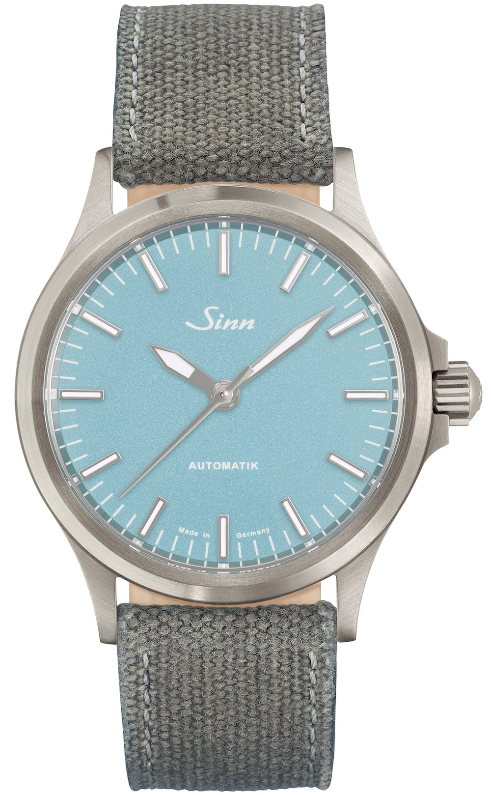 Sinn Watch 556 Aquamarine Blue Limited Edition 556.0115 Canvas Leather Grey. Gemstones are fascinating. Beautiful and pure, they are glittering symbols of permanence and perfection. Their wide range of colours is a particular source of admiration. This variety is also reflected in exotic-sounding names. These watches from the 556 series are equally colourful. Just 400 timepieces are available in each shade. In a departure from the brand’s usual aesthetic, their dials in emerald green, citrine yellow, aquamarine blue and carnelian red are impressive evidence that a fresh, contemporary look combined with SINN’s trademark design is a recipe for success. Inspired by gemstone colours, the dials feature rhodium-plated, polished appliques. To make them even more harmonious, the dials are finished using varnish with a metallic shimmer. This lends them a subtle glittering effect. Perfect readability is guaranteed thanks to the crystal made of sapphire crystal – a material we also use for the case back, which allows the movement to be admired in all its intricacy. The trademark SINN signature is also embodied in the mechanical stability. The watches are resistant to low pressure, waterproof and pressure-resistant up to 20 bar. Each watch comes with a stylish grey canvas leather strap with butterfly folding clasp as standard, adding the perfect finishing touch to this colourful timepiece.