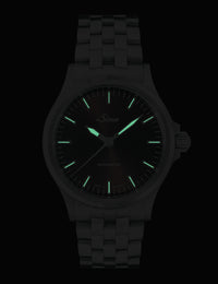 The unique and unmissable chocolate brown dial with sunburst decoration shimmers beneath the scratch resistant sapphire crystal glass with antireflective treatment, and like many Sinn watches, the dial also boasts indices and hands coated in luminescent colour for optimal visibility even in the dark. The Sinn 556 I M watch is completed by a tan calfskin leather strap with contrasting white stitching and a stainless steel folding clasp for effortless wear and comfort.