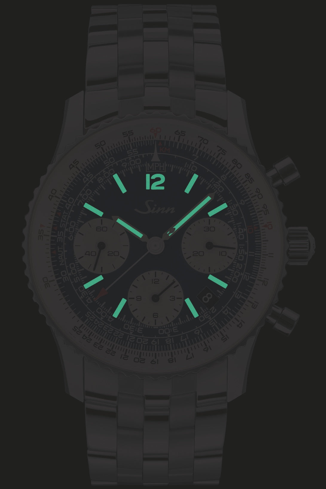 features a silver-electroplated bezel on the which can be smoothly operated from the outer diameter of the watch. The impressive water resistance of 20 bar testifies to a feat of engineering that has long shaped the SINN brand. The Tri-Compax arrangement of the silver-electroplated counters completes the classic navigation chronograph's design. The crowning glory of this model is its column wheel chronograph movement, which has a power reserve of at least 60 hours when fully wound. Watch connoisseurs will immediately recognise that the SINN logo as an appliqué is another fine detail of a consistently sophisticated watch.