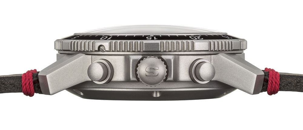 One special feature of the chronograph is the crown and push piece on the left side of the case to prevent pressure on the back of the hand and keep the watch from getting caught, even in time critical situations. The SZ01 chronograph movement developed in house and used in the EZM 1.1 is based on the tried and tested Valjoux 7750 and designed in such a way that the watch has a centre mounted, jump 60 minute stop hand.