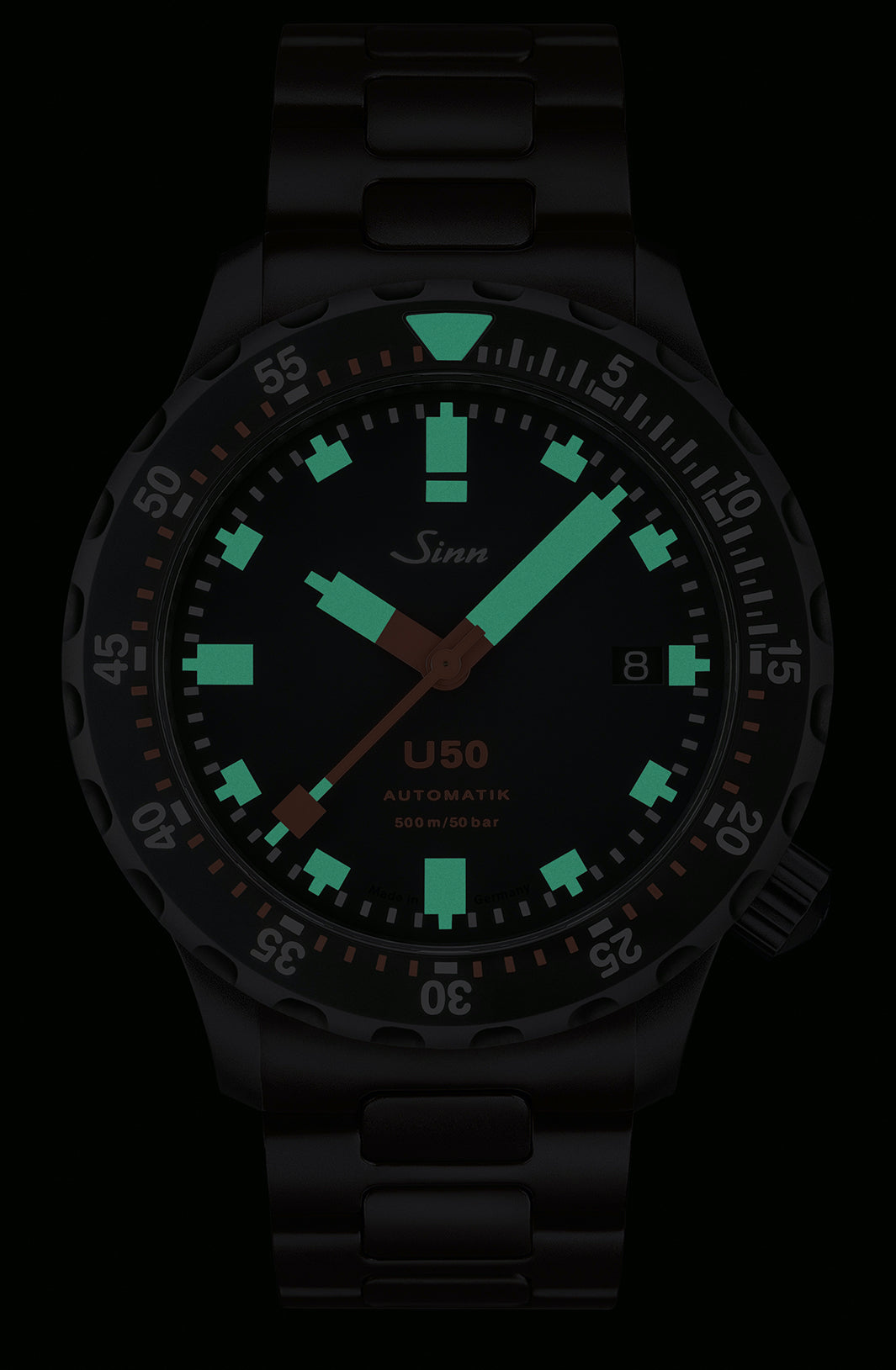This Sinn U50 S watch completely redefines the notion of a professional diver’s piece with a 41mm case engineered entirely from German Submarine steel. This material is known for being extremely resistant to sea water and processes the highest levels of non-magnetic properties, keeping the automatic movement within protected. Appealing to all kinds of discerning ocean explorers, the case of the Sinn U50 S is treated to a black hard coating and fitted with a captive diver’s bezel which has been treated using Sinn’s famous TEGIMENT technology. This innovation ensures that the surface has a significantly greater level of protection against scratches.