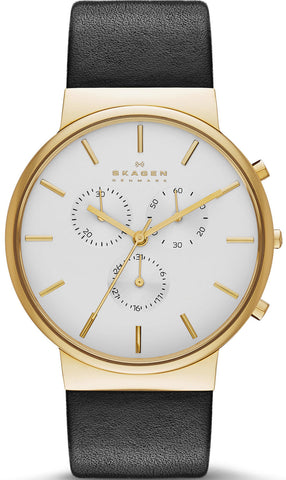 Skagen Watch Ancher Mens. The Ancher Men's Leather Chronograph Watch has a streamlined look with sharp lines. We designed the slightly larger 40 mm steel case with plenty of room for chronograph functions, which include a 60 second timer, 30 minute timer and a dial that keeps the date. Three easy to use pushers and a clearly legible dial make the Ancher Chronograph a highly functional watch for men.