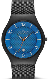 Skagen Watch Grenen Mens. The forceful tides off Skagen's shores inspired our choice of impervious metals and a deep blue dial for the Grenen Titanium and Steel Mesh Watch. The 41 mm case is of matte black titanium, and the contrasting dial is in textured glass fibre on the polished bezel, numerals are positioned at the even hours, broad strokes mark the odd hours and a discreet date window appears just above the 6 o'clock position. The black stainless steel mesh band closes with a brushed titanium fold over clasp.